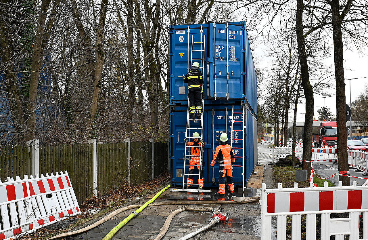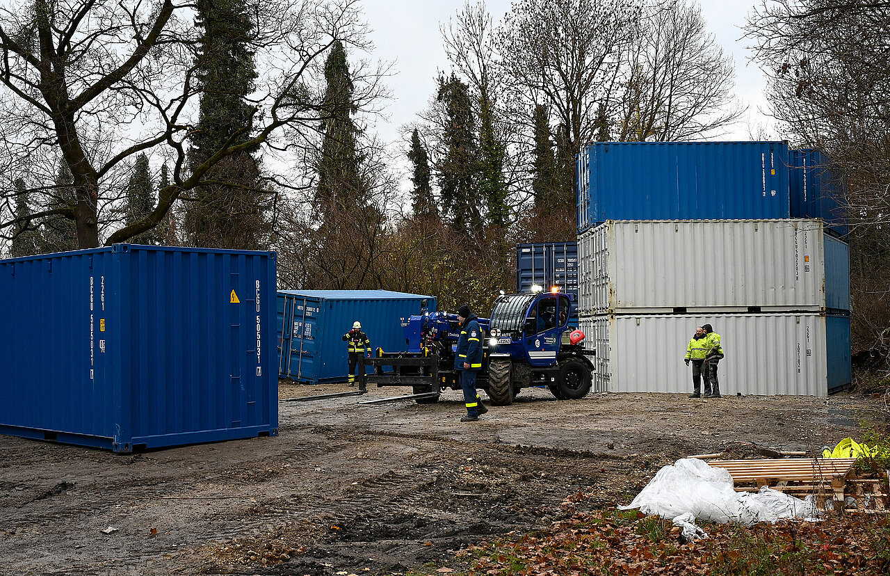 Erste Vorbereitungen für die Entschärfung begannen bereits am Mittwoch, 19. November, gegen Mittag mit einem Verbau rund um die Fundstelle mit Seecontainern.