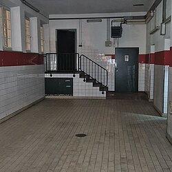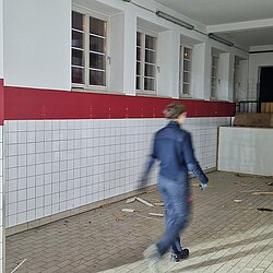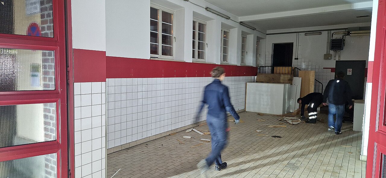 Kurz nach unserem Umzug wurden in unserer alten HLF Gasse die Vorbereitungen für die Kernsanierung geschaffen. Die Abrissfirma der Stiefelwasch entfernte die alten Leitungen, sowie die alten Wandfließen.