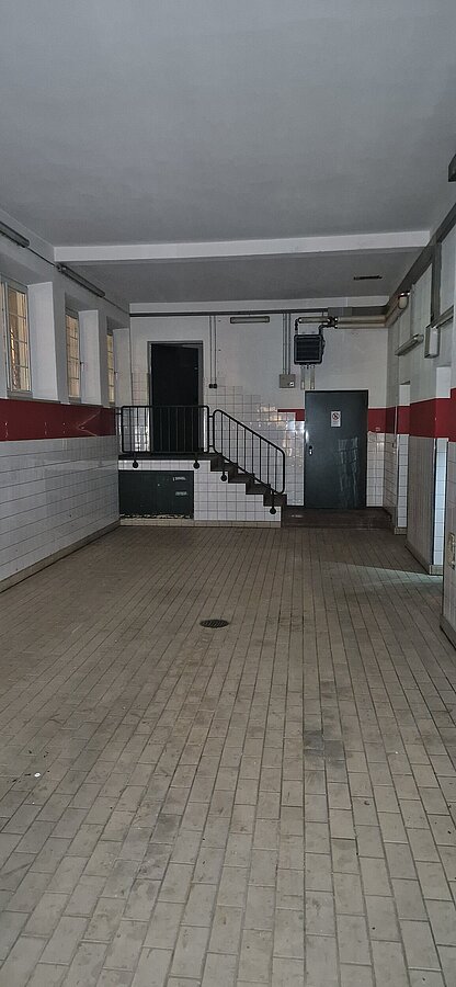 Nachdem die Halle somit bis auf das Grundgerüst entkleidet war, konnten die Firmen ihre Arbeit aufnehmen. Aktuell ist der Fließenleger dabei die Fließen an den Wänden anzubringen, nebenbei bemerkt eine schöne Farbe der Fließen.