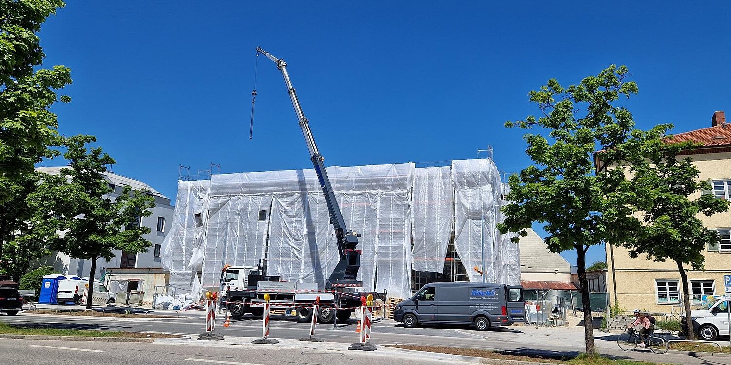 Monatelang konnte kein Münchner Bürger das Gebäude sehen, die arbeiten an der Fassade ließen dies nicht zu. Um vor der Witterung geschützt zu sein, wurde das gesamte Gerüst mit Planen eingehüllt. Jetzt am 11.06. ist es soweit, das Gerüst wird mit samt der Plane abgebaut. Die Fassade ist geschlossen und angestrichen, in einem strahlenden weiß leuchtet das neue Gerätehaus auf. Der zügige Abbau des Gerüstes ist nötig, sodass der Garten- und Landschaftsbauer mit ihrer Arbeit loslegen können, den noch ist die Kante von knapp 40cm zu hoch für unsere Fahrzeuge, selbst mit Allrad nicht zuschaffen. Aktuell steht nur noch die Südseite des Gerüstes, welche bis zum Wochenende komplett abgebaut sein wird.