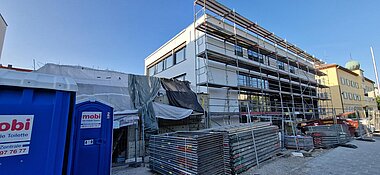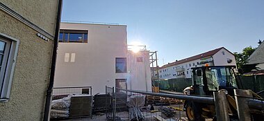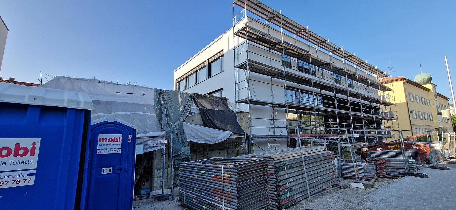 In den letzten Tagen wurde die Fassade auf der Nordseite fertiggestellt und gestrichen. Jetzt musste das Gerüst weichen, um für den Stahlbauer Platz zu machen. Dieser montiert die Fluchttreppe der einzelnen Stockwerke, vom Dach bis zum Erdgeschoss.