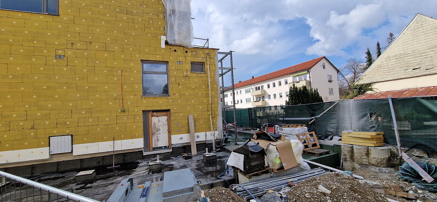 Das Dach der Tiefgarage wurde abgedichtet und die erste Dämmung an der Fassade wurde angebracht.